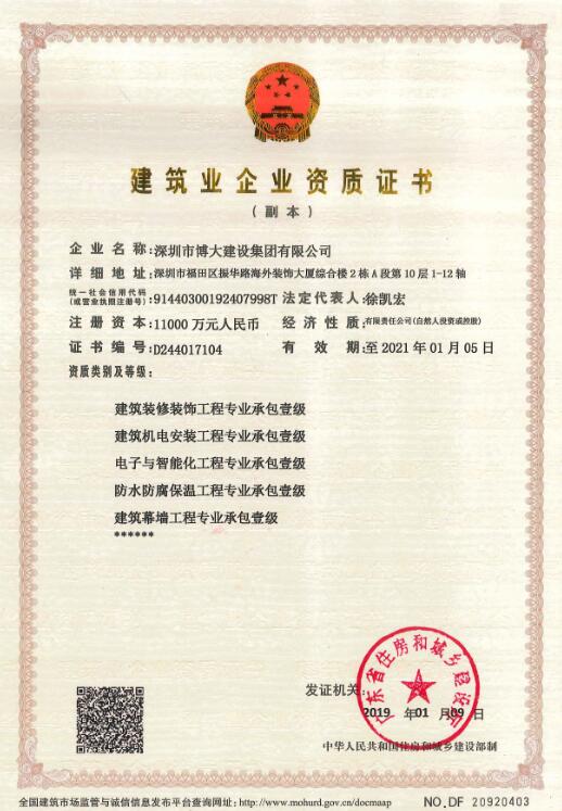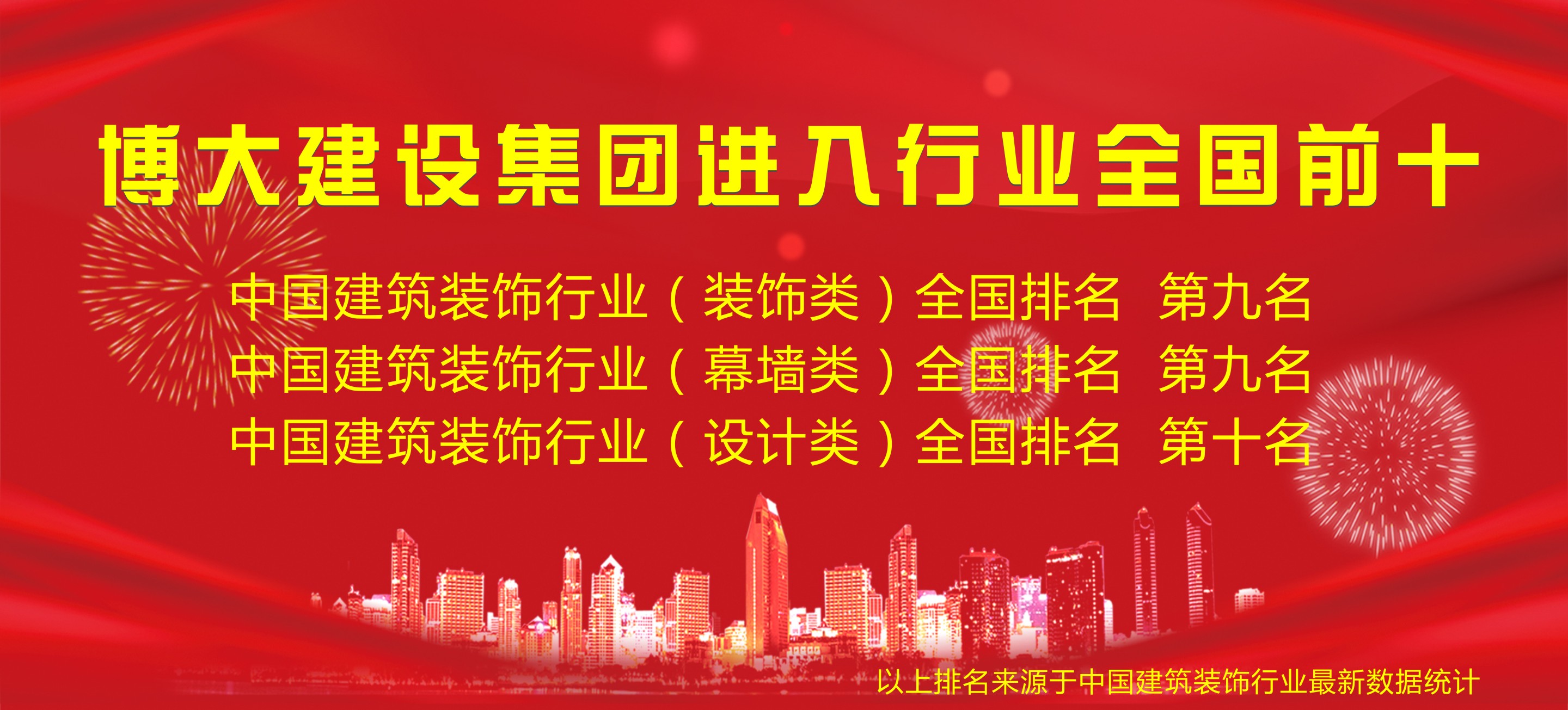 2019年1月9日,中國(guó)建筑工程裝飾頒獎(jiǎng)大會(huì)在北京隆重舉行,根據(jù)中國(guó)建筑裝飾行業(yè)綜合數(shù)據(jù)統(tǒng)計(jì),博大建設(shè)集團(tuán)憑借綜合實(shí)力,以?shī)^進(jìn)姿態(tài)挺進(jìn)行業(yè)全國(guó)前十,其中,裝飾類排名全國(guó)第九、幕墻類排名全國(guó)第九、設(shè)計(jì)類排名全國(guó)第十。
