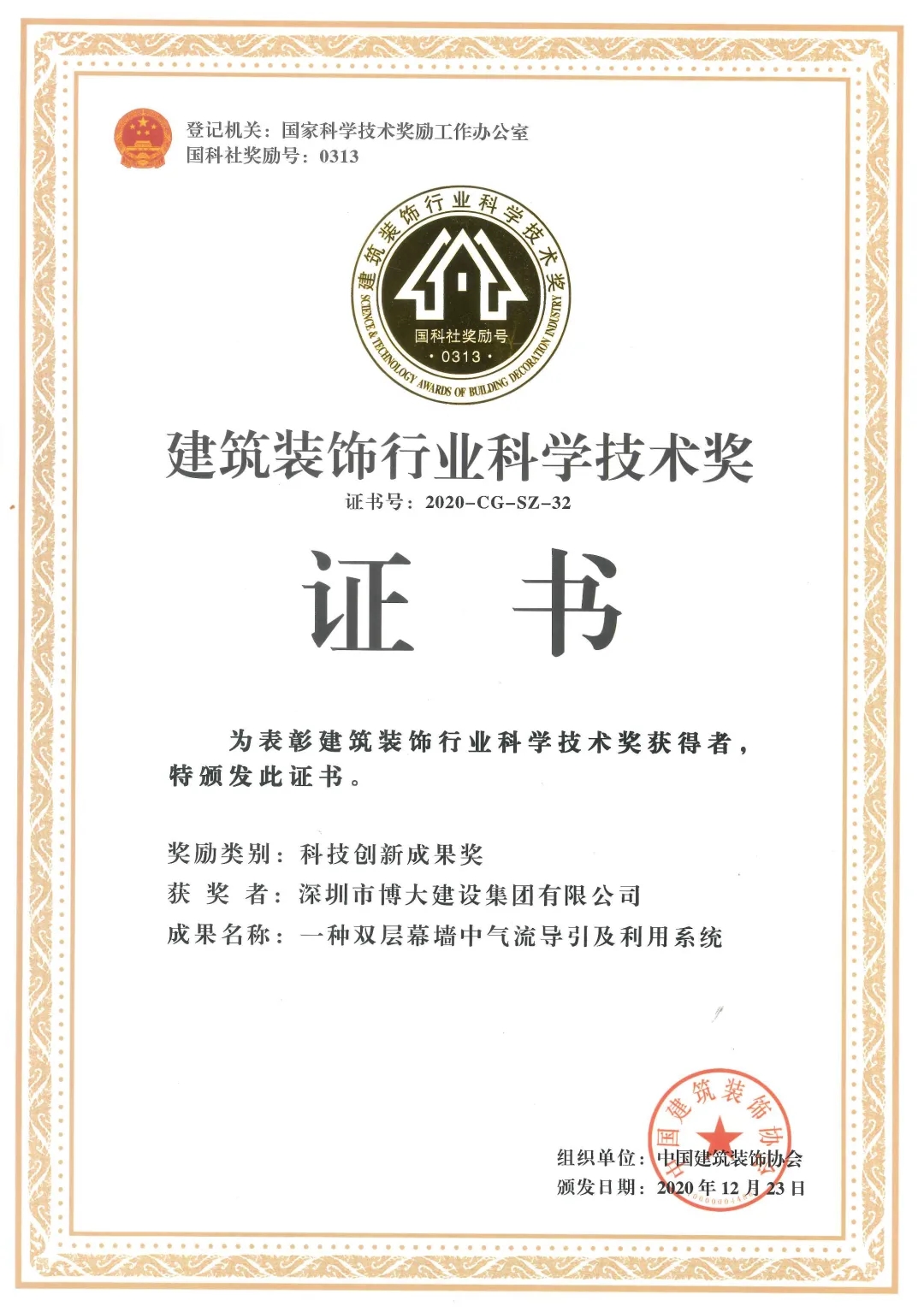 博大研發(fā)的一種雙層幕墻中氣流導(dǎo)引及利用系統(tǒng)創(chuàng)新技術(shù)榮獲二0二0年全國(guó)建筑行業(yè)科技創(chuàng)新成果獎(jiǎng)。