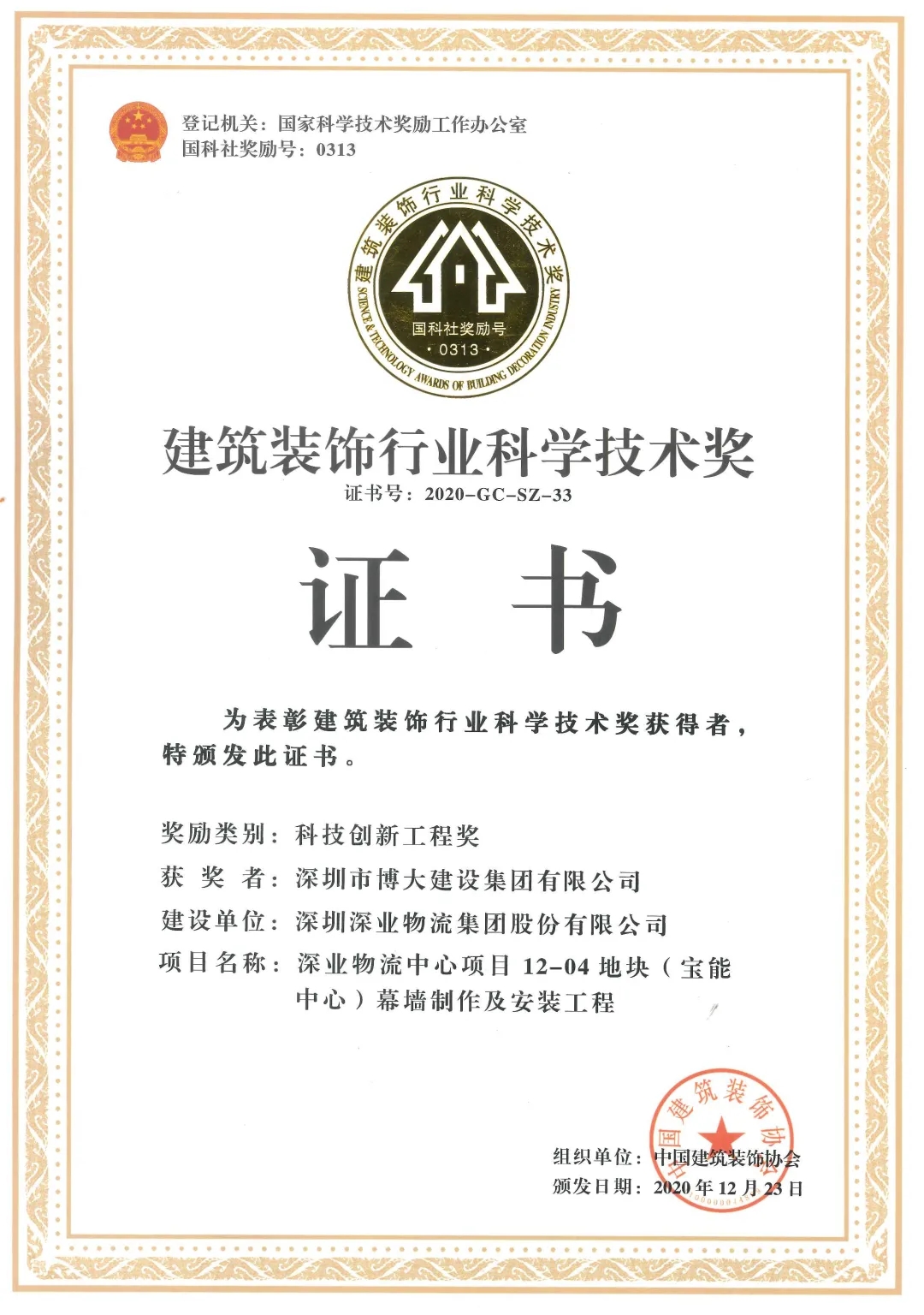 博大建設(shè)集團(tuán)承建的“深業(yè)物流12-04地塊(寶能中心幕墻制作及安裝工程)”榮獲二0二0年全國(guó)建筑行業(yè)科技創(chuàng)新工程獎(jiǎng)。