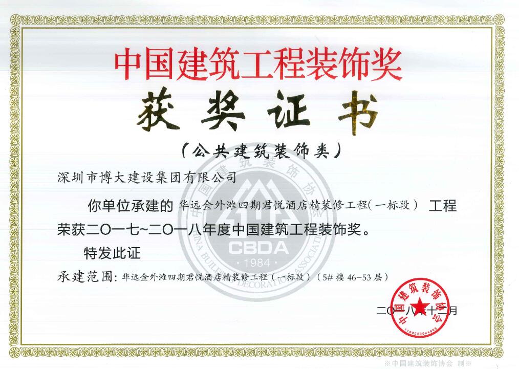 博大施工團隊憑借豐富的五星級酒店裝飾裝修經驗,相繼克服了材料二次運輸及周轉繁瑣、施工空間受限、垂直運輸、供材的不確定性等困難,完美達到裝修預期效果,得到客戶和行業(yè)的高度認可,榮獲中國建筑工程裝飾獎。