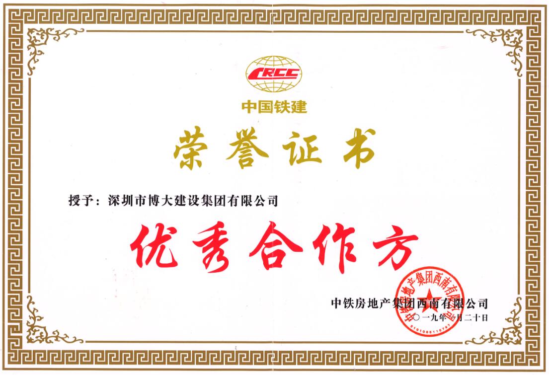 博大建設(shè)集團(tuán)以優(yōu)秀的工程質(zhì)量和準(zhǔn)時交期,協(xié)助中國鐵建奠定了西派國樾精裝大平層的品牌效應(yīng),榮獲中國鐵建優(yōu)秀合作方。