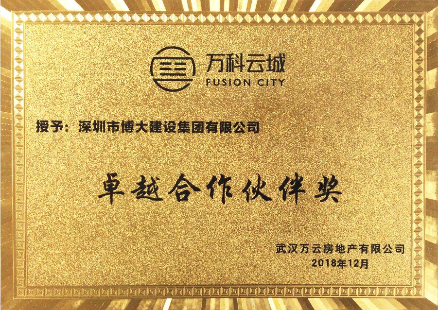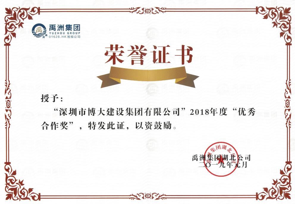 博大建設(shè)集團(tuán)承建了禹洲集團(tuán)湖北公司武漢賽洛城六期的精裝房工程,在武漢百盤維權(quán)的背景下,博大負(fù)責(zé)的精裝房一次性交房率達(dá)到98.41%,且工程質(zhì)量優(yōu)秀,幫助客戶成功避免了因交期、裝修質(zhì)量而造成的消費(fèi)者維權(quán)風(fēng)波。博大的綜合實力和用心服務(wù)贏得禹洲集團(tuán)湖北公司的高度認(rèn)可,榮獲2018年度優(yōu)秀合作獎。