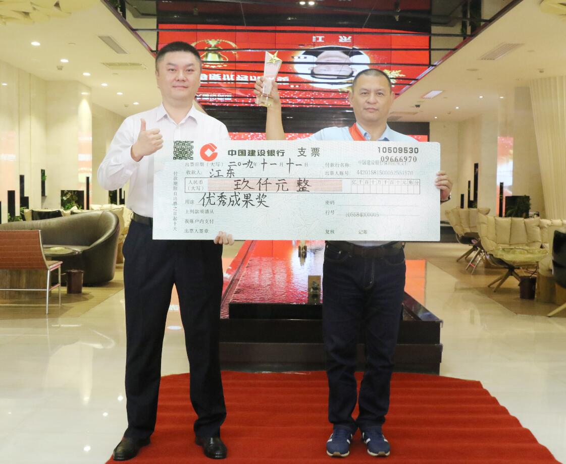 集團(tuán)常務(wù)副總裁沈雁飛在集團(tuán)業(yè)務(wù)拓展中做出突出貢獻(xiàn),被授予優(yōu)秀成果獎(jiǎng),獎(jiǎng)勵(lì)10萬(wàn)元。圖為徐凱宏董事長(zhǎng)、黃河副董事長(zhǎng)與獲獎(jiǎng)?wù)吆嫌傲裟睢?br />
