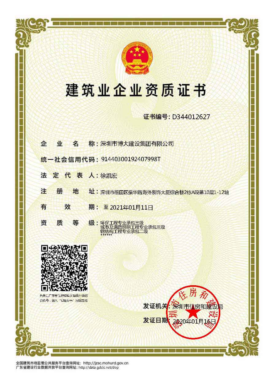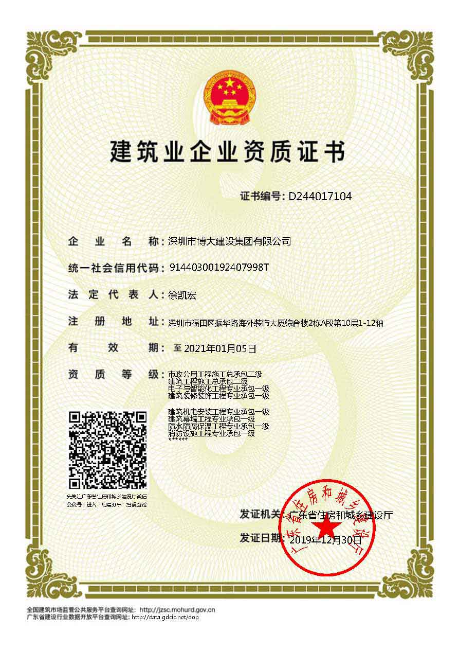 博大建設集團作為行業(yè)最具發(fā)展活力的領軍企業(yè),近年來發(fā)展速度迅猛,2019年繼續(xù)保持穩(wěn)步增長,業(yè)績過百億。在各級領導的關懷和全體家人的共同努力下,集團資質建設取得新的進展,榮獲6項建筑資質,具體如下: