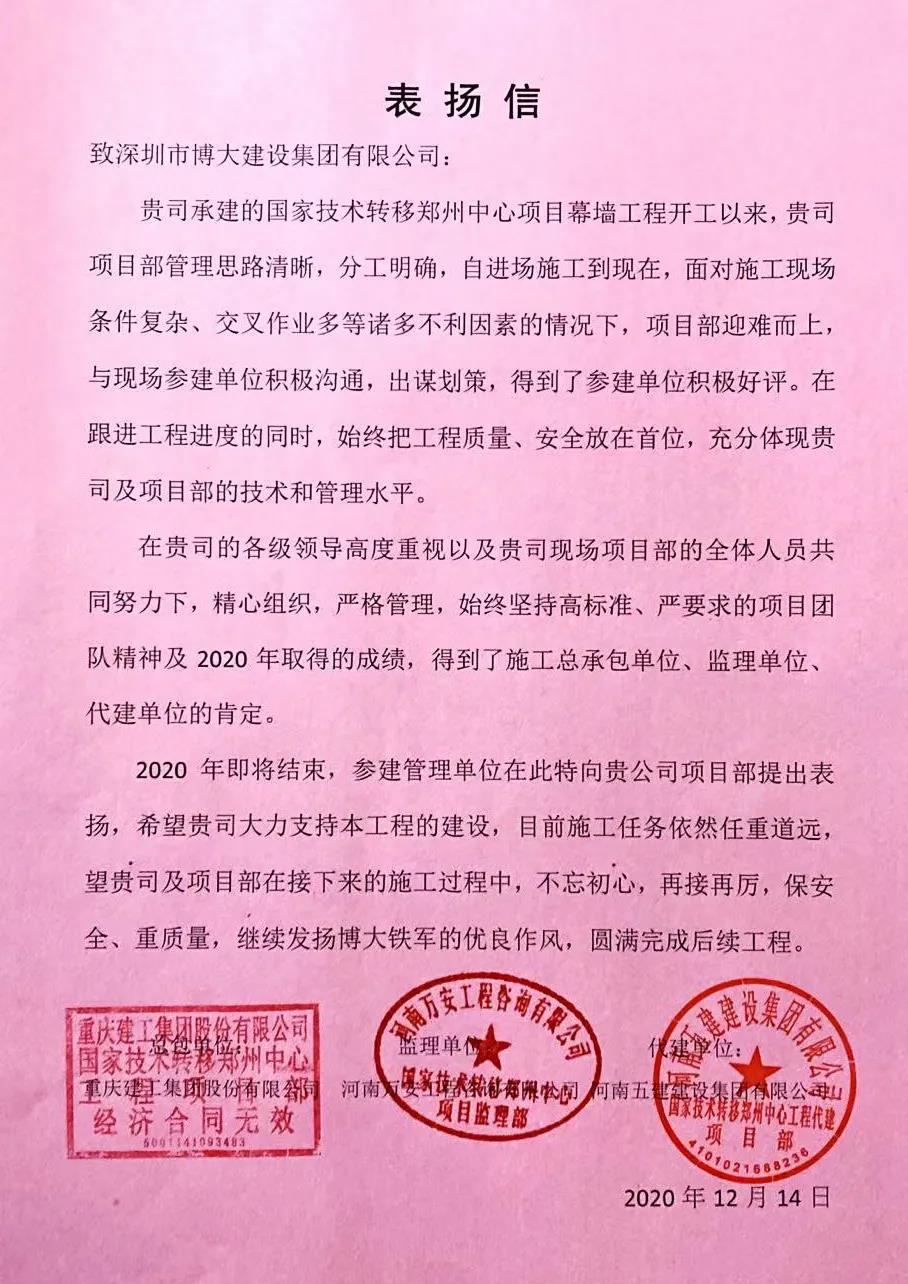博大榮譽(yù) | 以優(yōu)質(zhì)履約贏得三方表?yè)P(yáng)