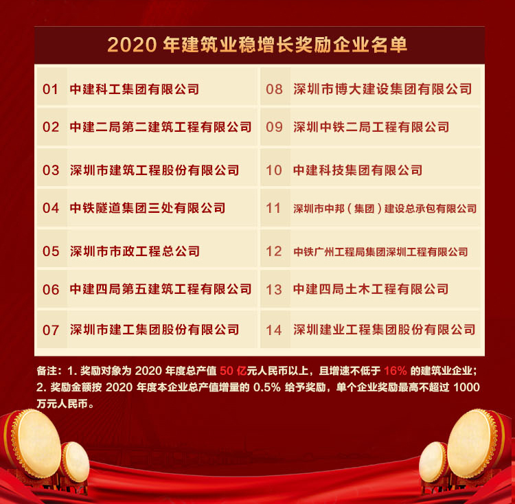 深圳市政府獎(jiǎng)勵(lì)政策規(guī)定:2020年總產(chǎn)值50億元人民幣以上、增速不低于16%的建筑業(yè)企業(yè),按照2020年本企業(yè)總產(chǎn)值增量的0.5%給予獎(jiǎng)勵(lì)。博大2020年產(chǎn)值增速遠(yuǎn)遠(yuǎn)超過政府規(guī)定的獎(jiǎng)勵(lì)標(biāo)準(zhǔn)。