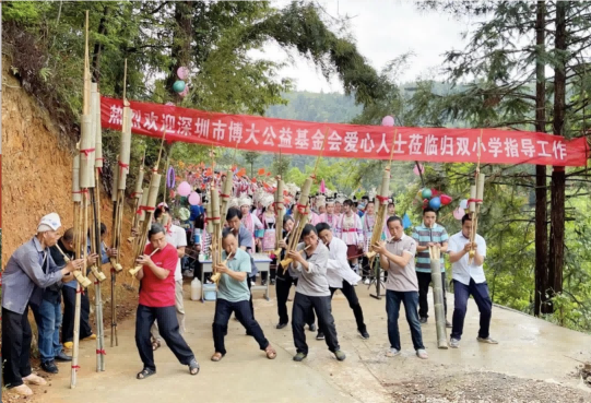 4月21日至22日,深圳市博大公益基金會(huì)理事長(zhǎng)、集團(tuán)董事長(zhǎng)張炳來(lái)前往貴州省黎平縣實(shí)地考察擬捐建學(xué)校場(chǎng)地,并回訪2021年交付當(dāng)?shù)卣褂玫膭?wù)孖小學(xué)。當(dāng)?shù)厝罕娸d歌載舞,熱烈歡迎理事長(zhǎng)張炳來(lái)的到來(lái)。